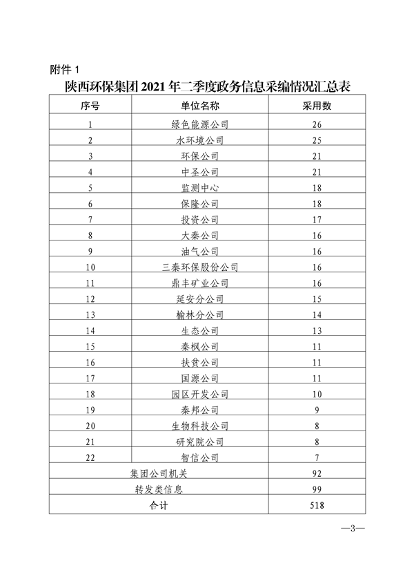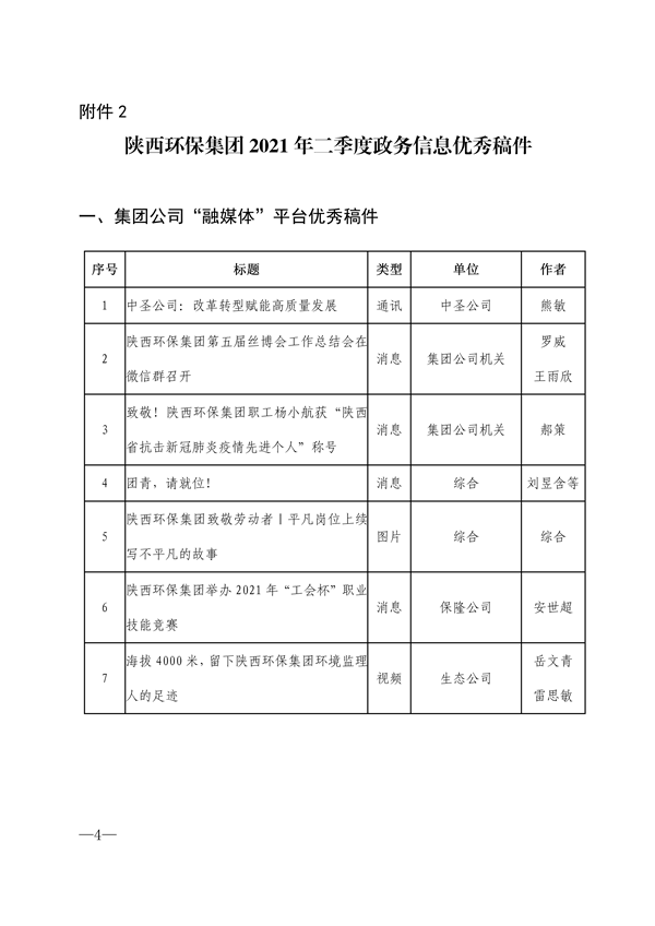 为加强集团公司门户网站、微信公众号、新浪微博等“融媒体”平台的稿件采编工作,鼓励广大通讯员围绕企业中心工作撰写出高质量的稿件,发挥优秀稿件的示范作用,为集团高质量发展鼓与呼,按照集团公司《关于建立政务信息采用情况通报和优秀稿件评选制度的通知》陕环司函〔2021〕31号文件要求,现将2021年二季度集团公司“融媒体”平台稿件采用及优秀稿件评选情况通报如下: