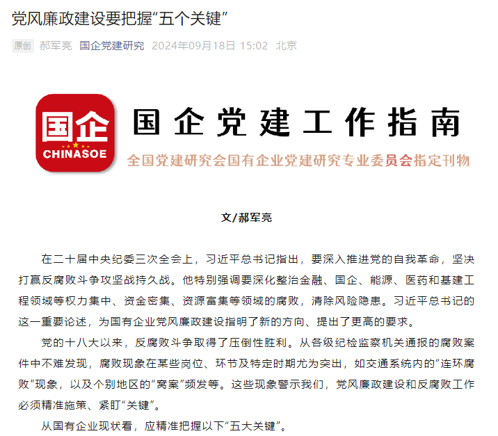 日前出版的《国企》杂志刊发了6686体育官网集团党委书记、董事长郝军亮同志文章《党风廉政建设要把握“五个关键”》。现刊载如下,以飨读者。