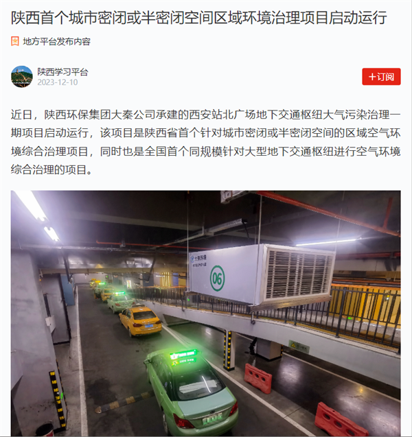 近日,学习强国、中国环境报、陕西科技报、三秦企业文化网、陕西国资等主流媒体对6686体育官网集团大秦公司承建的全省首个城市密闭或半密闭空间区域环境治理项目“西安站北广场地下交通枢纽大气污染治理一期项目”大气污染治理成效等情况进行了报道,现刊载如下,以飨读者。