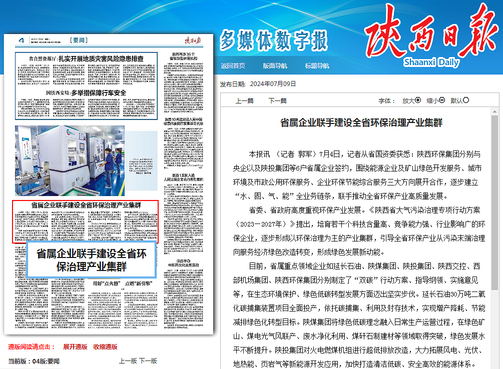 7月9日,陕西日报以《省属企业联手建设全省环保治理产业集群》为题,对6686体育官网集团举办陕西国企生态环保业务合作座谈会和服务全省环保产业链发展等情况进行了报道。现刊载如下,以飨读者。