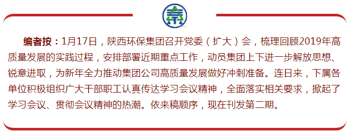 ◎油气公司 1月19日,油气公司召开专题学习会,传达学习集团公司党委(扩大)会精神。 会议指出,一是面对新机遇,要有新担当。要深刻认识到公司当前面临的新机遇和新挑战,在谋划和落实全年工作任务中树立担当意识,增强实干精神。二是面对新任务,要有新作为。项目建设要有新进展、融资工作要有新举措、党建工作要有新提升。三是面对新要求,要有新状态。要重点抓好能力素质提升、学习培训、作风转变、队伍建设以及廉政教育等五个方面的工作。 会议要求,临近年终岁尾一要切实做好巡察、审计反馈问题的整改工作,过一个踏实年;二要严防安全环保风险,严格落实各项制度要求,确保项目安全高效推进,过一个安全年;三要加强节日期间执行违规收送礼金问题整治和纠正“四风”问题,过一个祥和年。(宋俊) ◎投资公司 1月20日,投资公司召开专题学习会,集中学习集团公司党委(扩大)会精神。 会议指出,一是高度重视、认真落实集团公司会议精神;二是提前梳理2020年目标任务,强化责任落实;三是以风险防控为导向,团结奋进、顽强拼搏,扎实推进各项工作任务。 会议要求,一要全面落实巡察审计反馈问题的整改工作;二要进一步提升经营管理水平,坚持集体研究决策;三要切实强化风险防控,建立健全风险防控体系;四要高度重视违规收送礼金问题专项整治工作,确保严格执行中央八项规定,切实增强廉洁自律意识。(亢茜) ◎园区开发公司 ◎三秦环保股份公司 1月20日,三秦环保股份公司召开党总支(扩大)会,全面传达落实集团公司党委(扩大)会精神。 会议指出,要认真贯彻落实集团公司党委(扩大)会精神,切实把思想、认识、行动统一到集团公司的重大决策部署上来,要深刻领会集团公司党委书记、董事长熊良虎所作讲话精神,紧紧围绕开启高质量发展新局面,深入分析总结2019年工作,精心谋划好2020年工作,抢抓机遇、分秒必争地推动各项工作落实,确保开好局、起好步,为2020年目标任务高质量完成奠定坚实基础。 会议要求,一要围绕2020年目标任务,找准工作薄弱环节,全方位思考落实举措,勇于担当、善做善成地保障全年目标任务高质量完成。二要强化考核导向,量化分解目标任务,全方位客观公正考核,以考核实现强激励和差异化薪酬分配,以考核推动各项工作高效落实。三要继续深入推进“双百行动”改革,不遗余力抓好各项改革措施落地,确保“双百改革”全面激发企业发展活力。四要践行高质量发展要求,好中选好、优中选优的布局项目、落地项目、建设项目,建成投产项目重抓运营质量和水平提升,为全面推进高质量发展打下坚实基础。五要抓好审计整改工作,举一反三自我检视,建章立制完善管理,切实把审计整改工作作为系统规范管理的有效抓手。六要发挥好市场“先锋队”作用,全面精细开发市场,以市场的有力支撑保障全年生产经营目标任务的圆满达成。七要强化安全环保红线意识,克服麻痹侥幸心理,专心专责做好节假日值班工作,细致入微地落实好各项安全环保措施。八要强化团结协作和服务保障意识,一切以企业的发展目标为行动纲领,坦诚交流求同存异,心无旁骛凝心聚力地抓好工作落实。(田启宏)